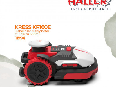 Beim Herbstfest von Haller Forst & Gartengeräte wartet ein Highlight für alle Gartenfreunde: der Kress KR160E, ein kabelloser Mähroboter für Flächen bis 600 m², zum Sonderpreis von 1199 €.